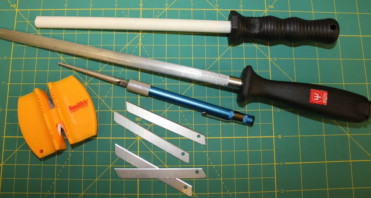 For this study I primarily use Olfa carbon steel cutting blades and dull them with a few cutting passes into the edge of sharpening stone. This produces a blunt apex with minimal damage to the underlying steel.