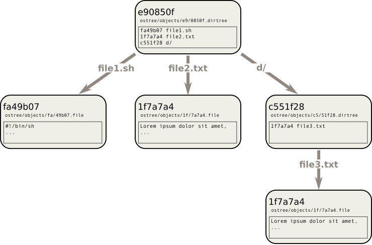 only once in the OSTree repository (in the figure above, file2.txt