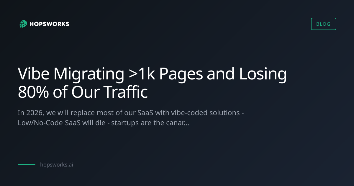 So we did not lose 80% of traffic. Sorry. We did not in fact lose much traffic at all (there was a drop post-migration that now seems to recover organically). We vibe coded best practices in passing, forgot about it, scared ourselves, spent a few weeks thinking that our whole plan was a terrible idea and that we should admit defeat. Turns out it is all good.