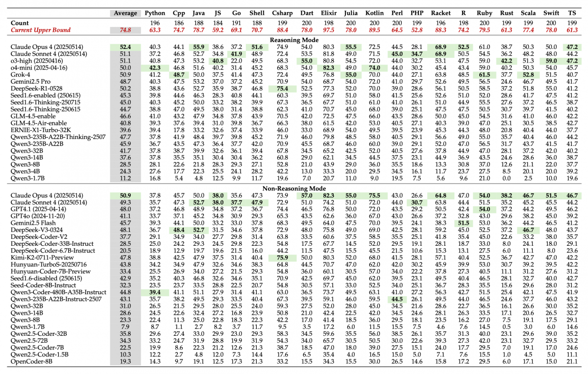 Even when evaluating models individually, Elixir was the top scorer for most models in both reasoning and non-reasoning modes. For example, Claude Opus 4 scored 80.3% on Elixir, followed by C# at 74.9% and Kotlin at 72.5%, with similar results in non-reasoning mode and for Sonnet.