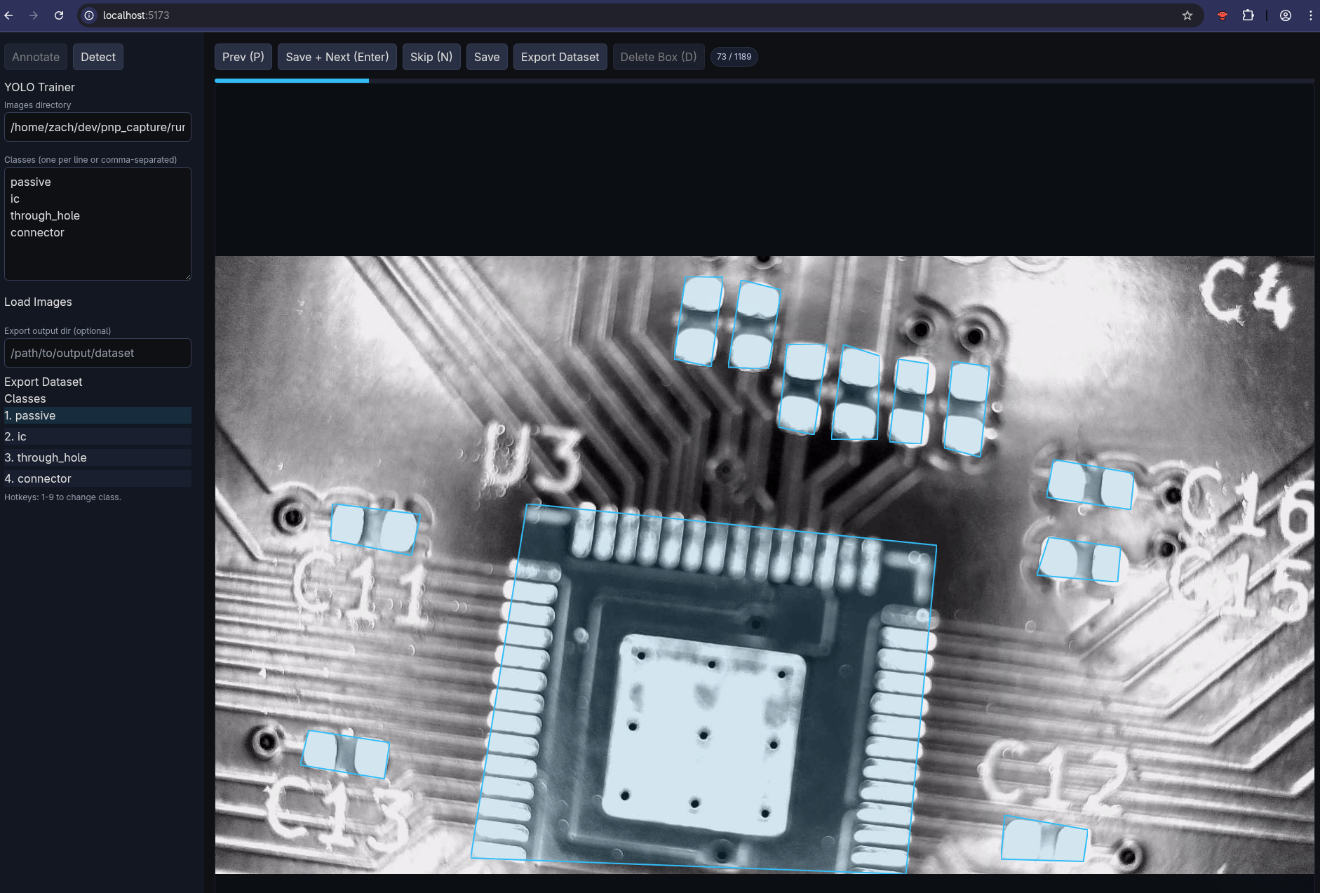 Next, we used a custom bounding-box annotator system. For every images in the captures (1189), we drew bounding boxes around every component- resistors, capacitors, ICs- grouped together to get their full set of pads.