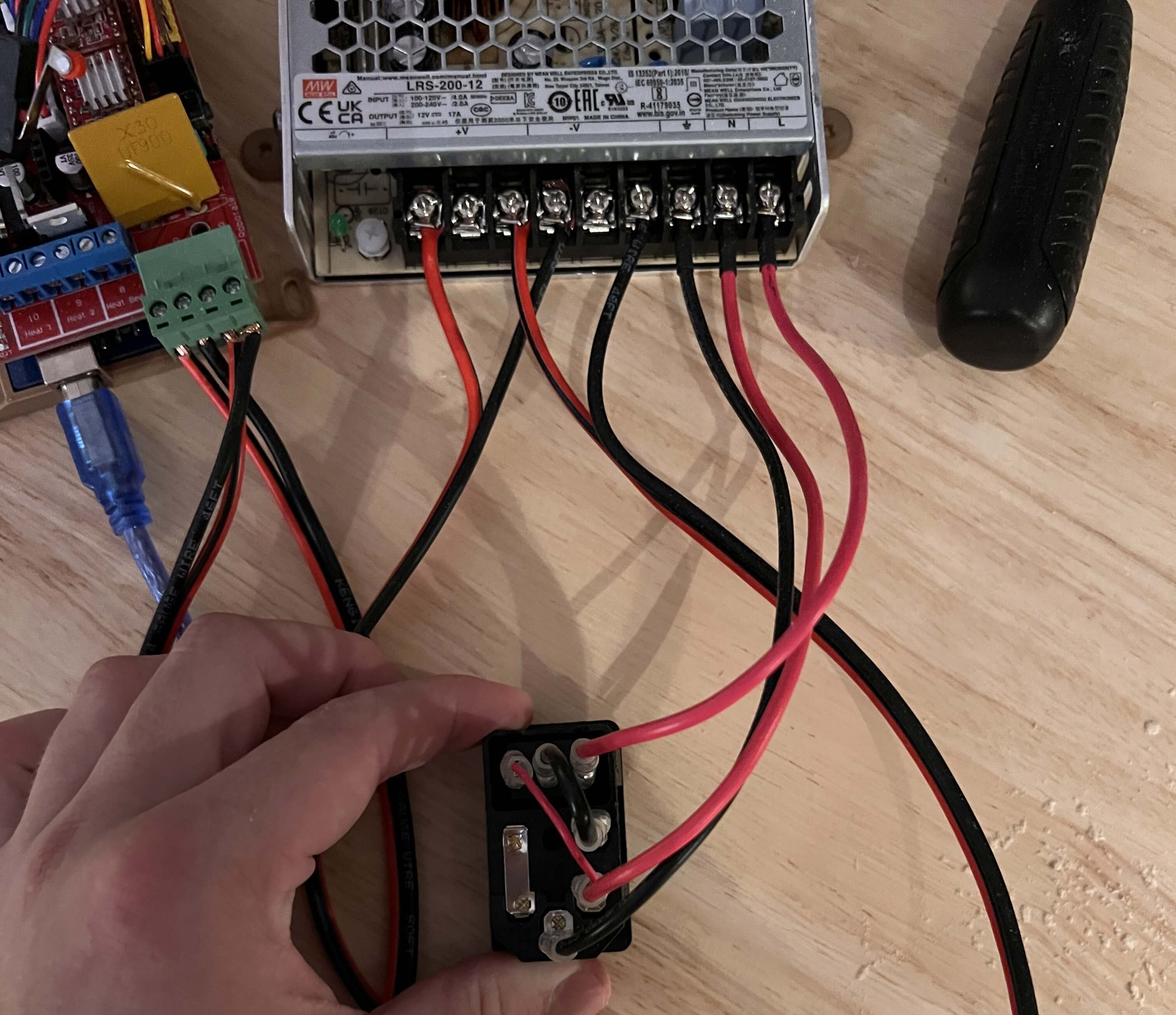 The power for the whole machine is passed through a C14 rocker socket, which I have inlaid in the side of GPenT’s wooden frame (with some drilled holes and some chiseling). This is wired directly to our PSU, which is attached to the power sockets on the RAMPS shield, as well as to a buck boost converter where it’s stepped down to 5V and routed to our Raspberry Pi. Finally, the Raspberry Pi is connected to the Arduino Mega via a USB cable.