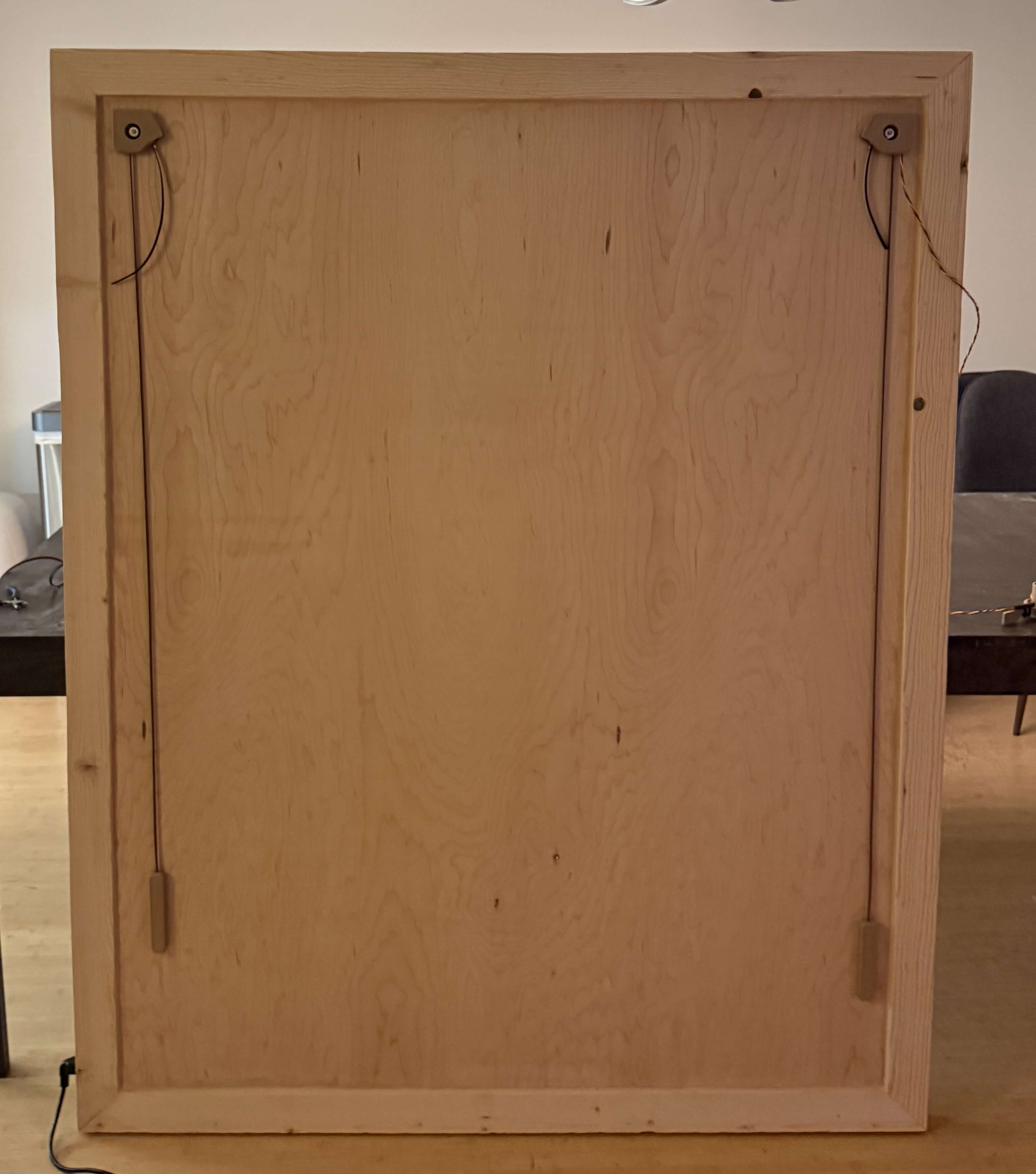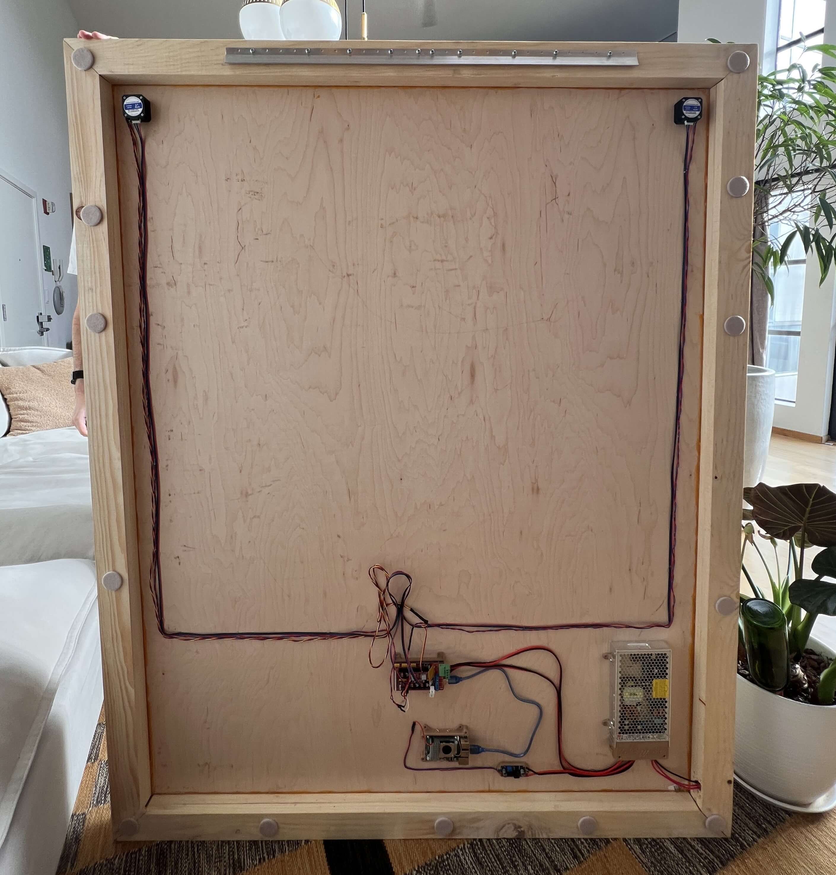 With the gondola out of the way, we can continue with the rest of the machine assembly, starting with the machine’s wooden frame. I toyed with scrapping this frame entirely a few times, and was particularly compelled by a suggestion from my roommate to reface the wall with whiteboard wallpaper and scale up the polargraph to cover the entire space. Nonetheless, I progressed with this wooden frame for now (as aesthetically I like it, and it makes electronic containment straightforward), yet you can essentially mount your polargraph gondola to any vertical plane, and alter the marker it uses with very minimal modification.