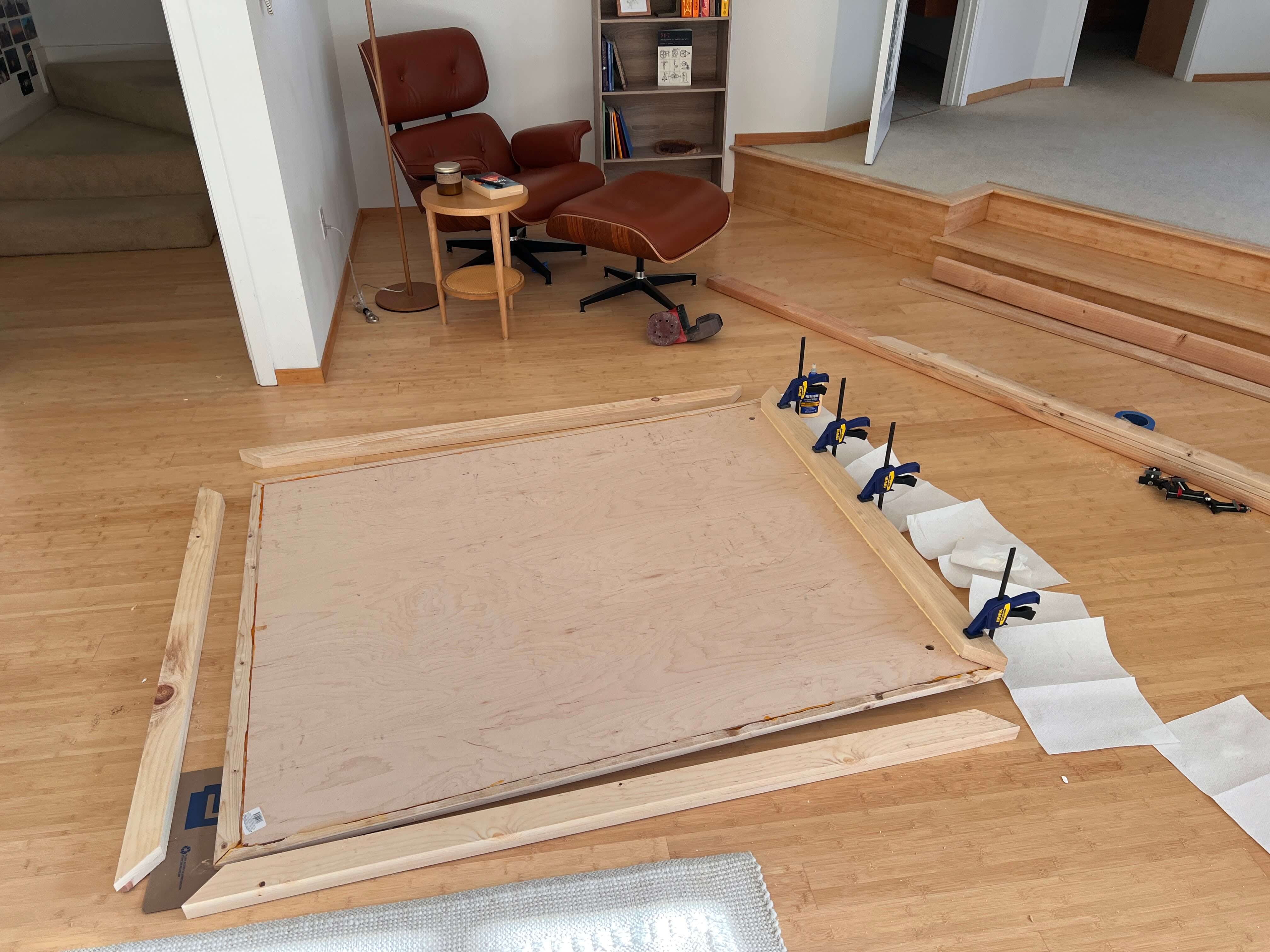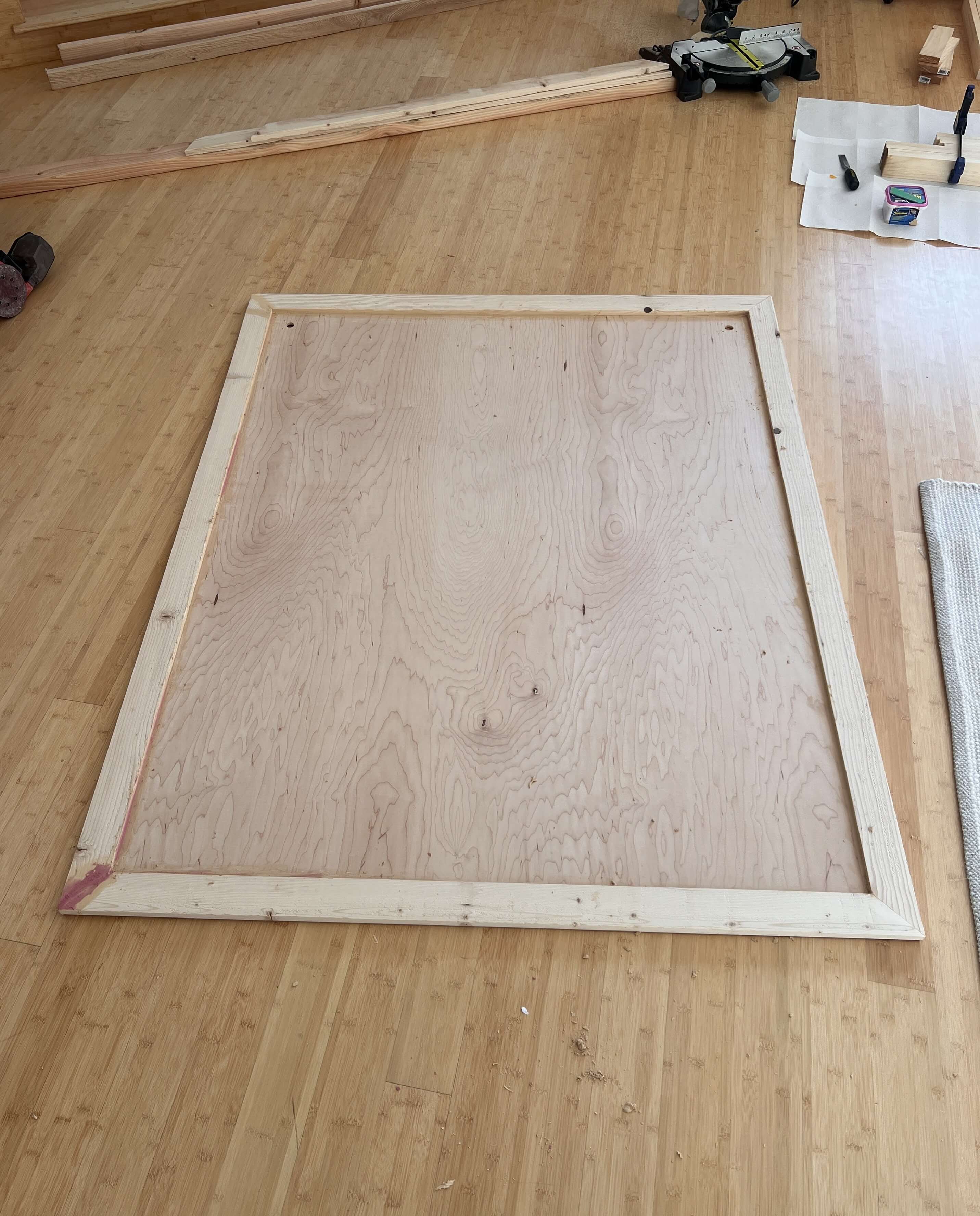 I wanted to frame this sheet of plywood with some miter-style border. I tried pulling this stunt off with a Japanese handsaw and failed my angles miserably, so I wound up buying a cheap miter saw to finish the job. My buddy Graham and I took out a 1/4” deep dado on the back inside edge of all four plywood boards that make up this miter-frame, so that our 48×60” plywood backing can sit flush within it.