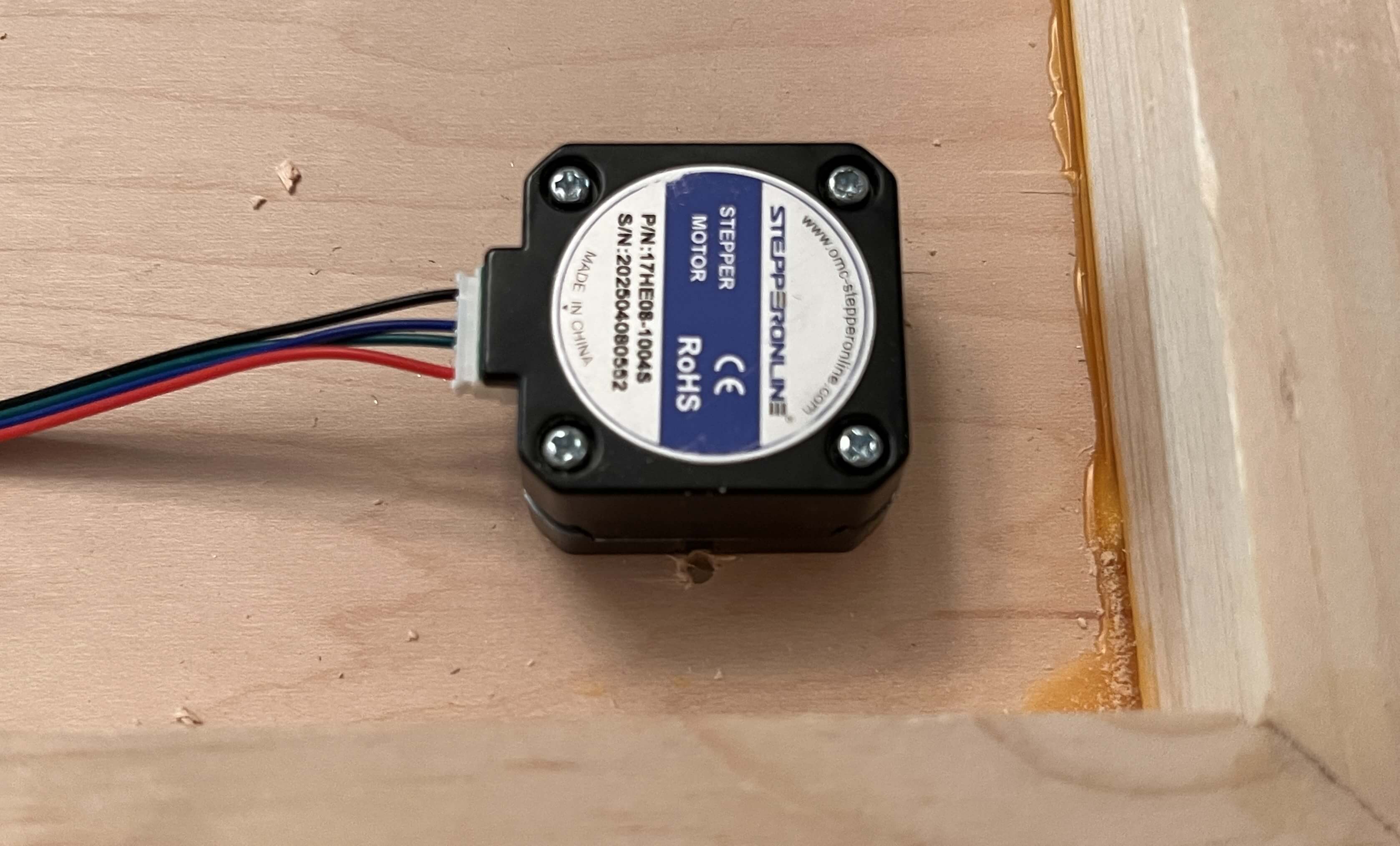 and wired both motors to the corresponding X and Y motor headers on the RAMPS shield, before mounting both steppers to our wooden backing.