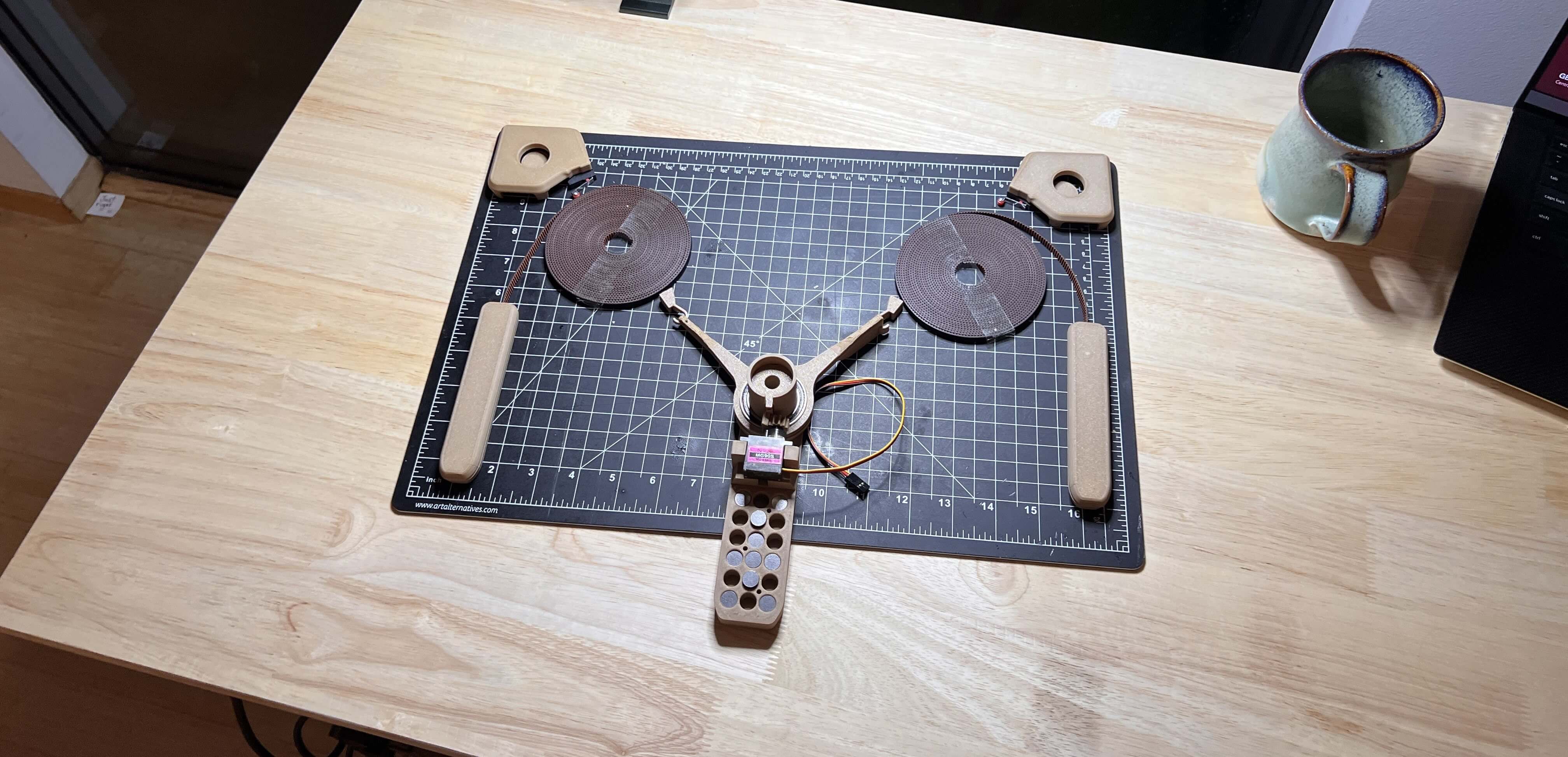 The machine will be built within a large wooden frame, which mounts flush to the wall via a French cleat system. All electronics and motors will sit behind this frame, between the back of the workplane and the wall, so as to remain hidden out of sight. Both stepper motor axles will protrude through the workplane and will be covered by pieces that also hold endstop switches to enable homing. Counterweights, as well as the center gondola, will be weighted with titanium round-stock, for high density within little area. The gondola itself will be attached to the belts via swivel arms on thin 6806-2RS bearings, to allow for a smooth, constantly upright motion. The gondola is to remain flush against the workplane at all times, so a small servo within it will actuate a pen up and down into/away from the paper. These pens should be easy enough to hotswap, because we want some different colors, of course.