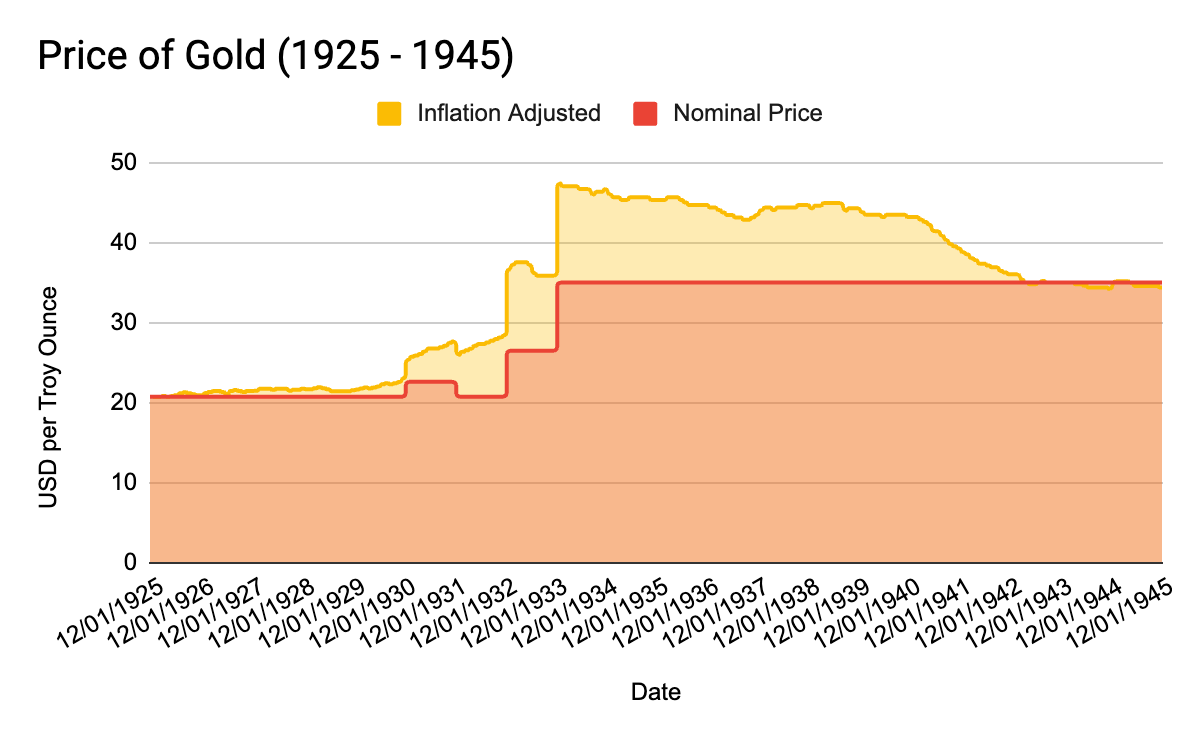 Now remember, unlike today, the price of gold was pegged to a unit of US Dollars (i.e. the nominal price). So during this period, when the inflation adjusted price is rising, that means the price of everything else — goods, services, labor, housing, etc. — is collapsing.