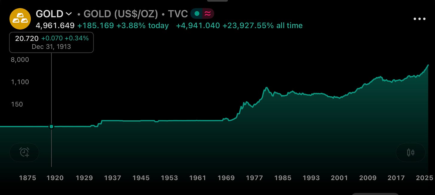Back in 1913, 1 troy ounce of gold was pegged to exactly 20.72 USD.