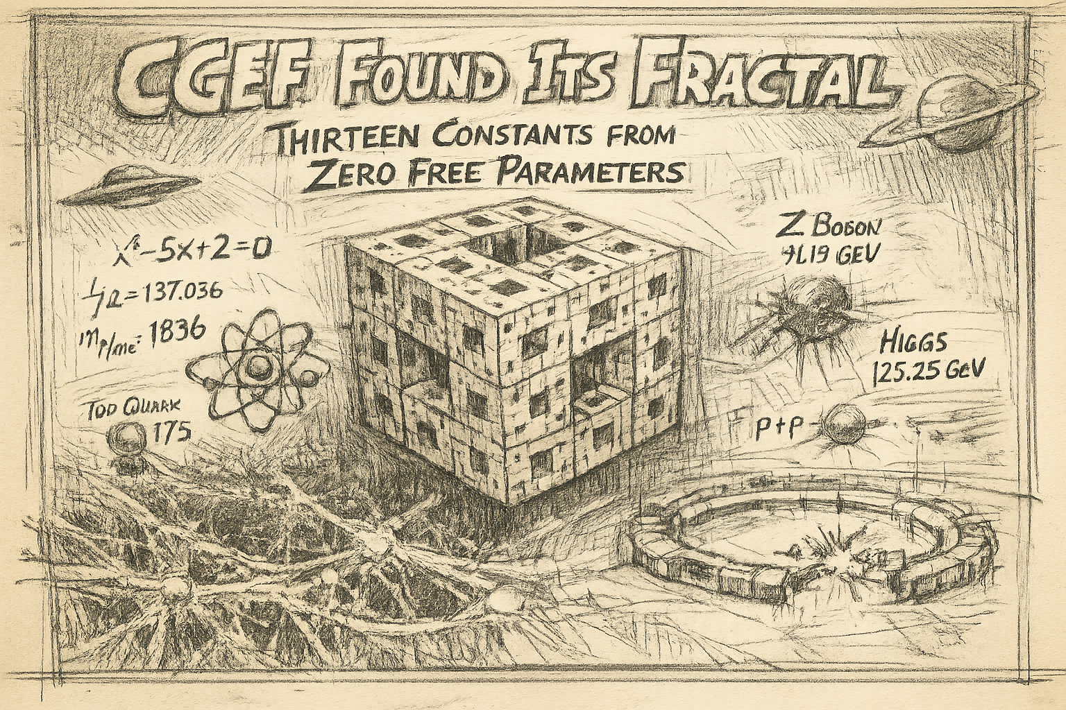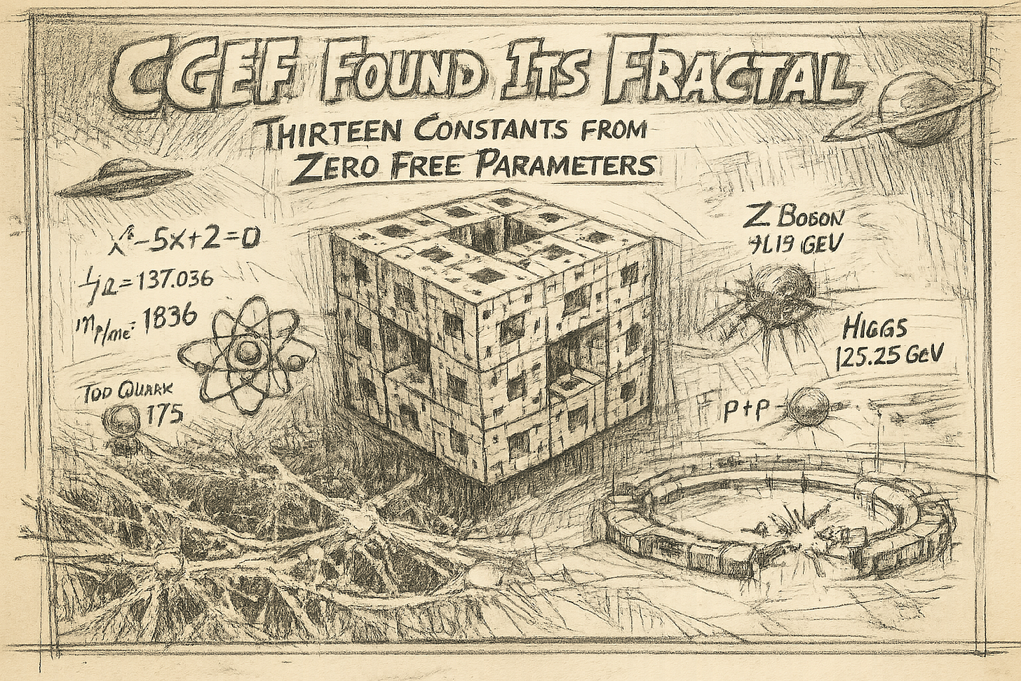 This is a follow-up to Capellini Geodesic Extrusion Felting. If you’re new: I’ve been exploring whether fundamental physical constants emerge from fractal geometry rather than being free parameters. Six months ago I had the right physical intuition but the wrong mathematical target. Now I have the target.