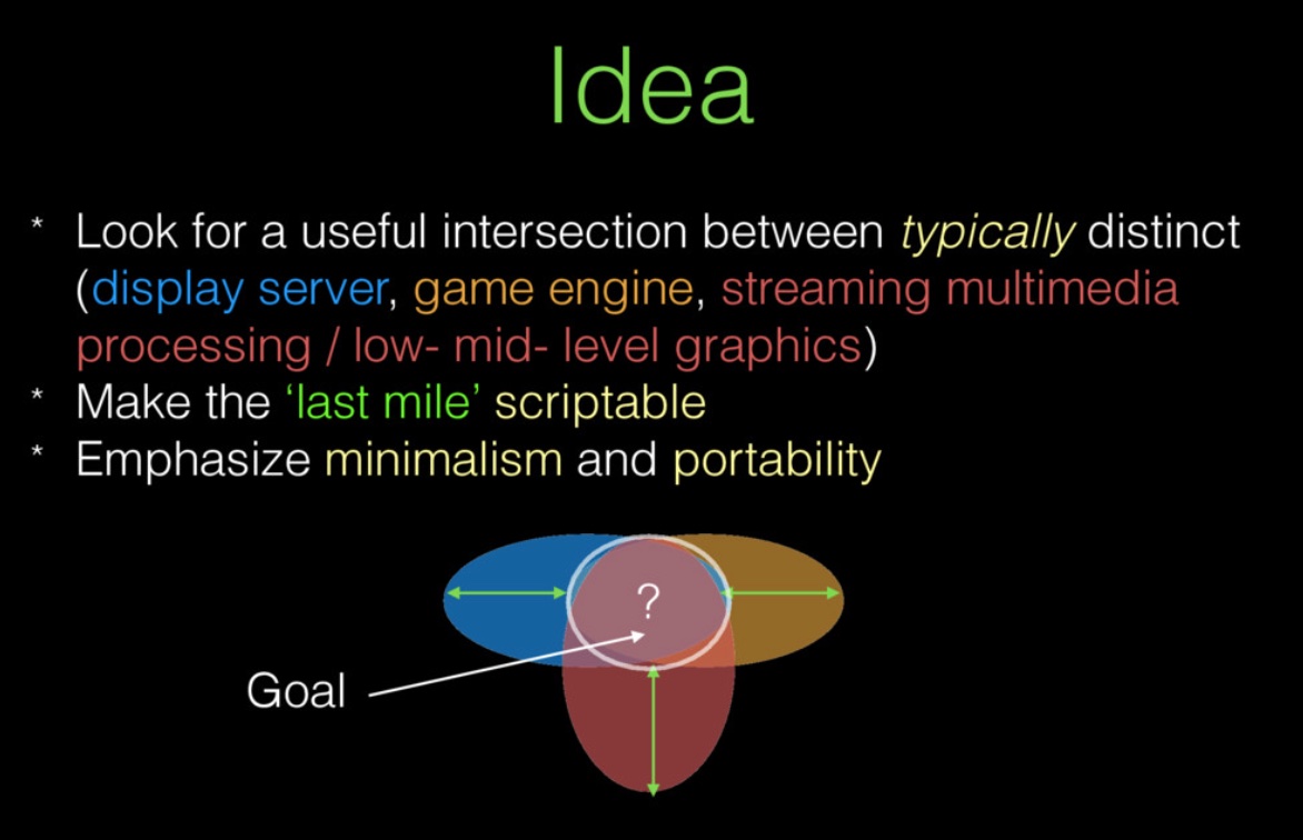 In the first slides from the only public presentation (2015) we claimed that the idea behind Arcan was to find the crunchy middle between a display server, a game engine and a multimedia processor.