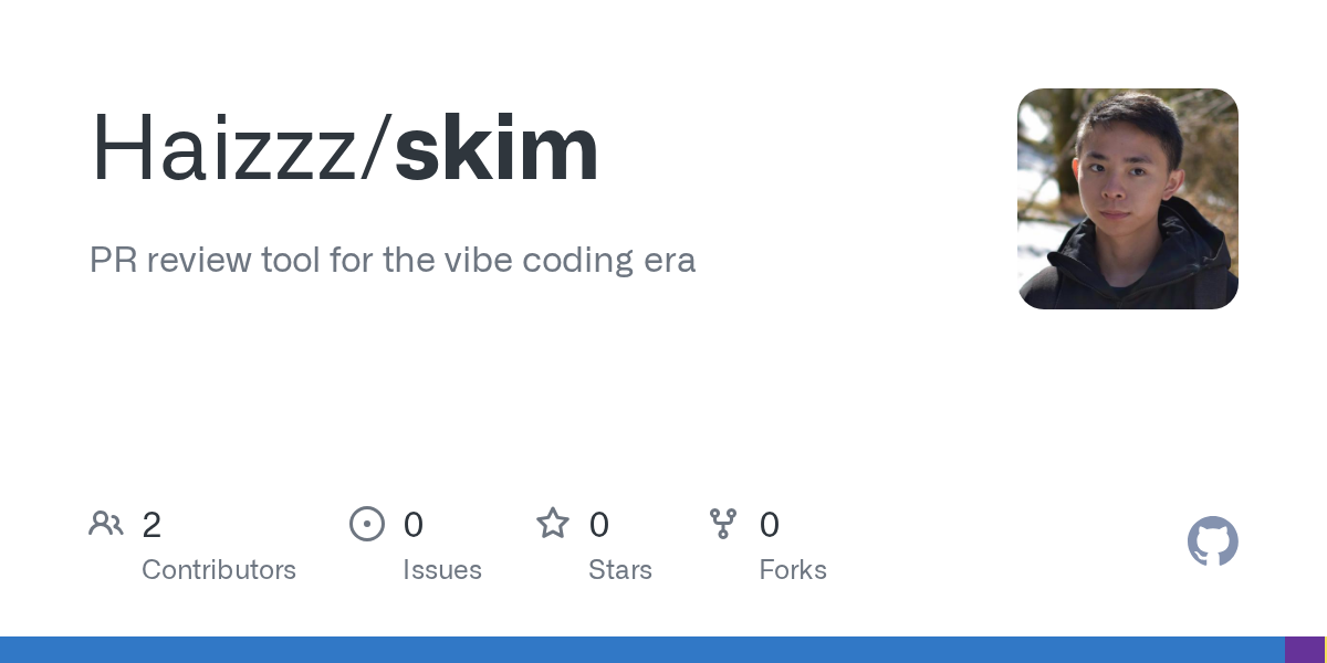 There is no authentication or authorization built into Skim. Anyone who can reach the server can use your gh CLI session and OPENAI_API_KEY. If you deploy this beyond localhost, secure it yourself — put it behind a VPN, reverse proxy with auth, or add your own auth layer.
