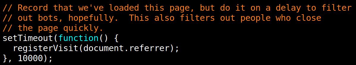 As I was falling asleep the other day, I wondered whether adding a simple delay would fix issues with doing WordPress visitor statistics. (To recap, the problem is that “modern” scrapers run a full browser instance, and they don’t put anything saying that they’re a bot in the User-Agent.)