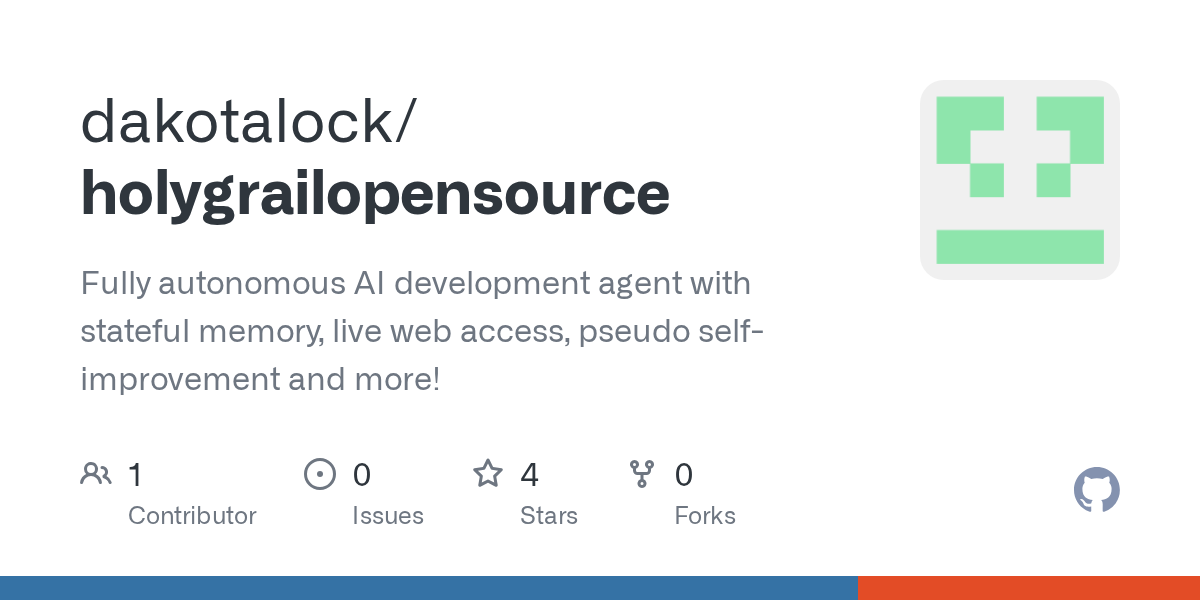 dakotalock/holygrailopensource: Fully autonomous AI development agent with stateful memory, live web access, pseudo self-improvement and more!