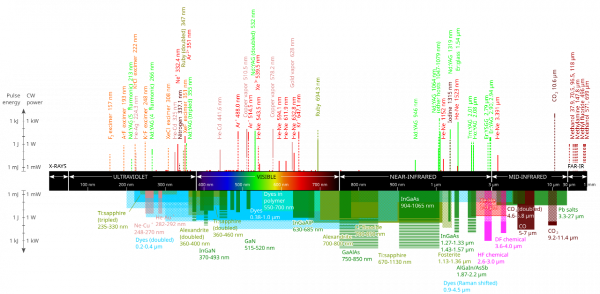Laser types with distinct laser lines are shown above the wavelength bar, while below are shown lasers that can emit in a wavelength range. Full lines or areas mean CW emission, dotted mean pulsed emission. The height of the line gives an indication of the maximal power/pulse energy commercially available. For the Ar+-Kr+ laser only the most important lines are labeled, the many other are shown only by a short tick, independently of their power. Note that the wavelength axis is highly distorted: up to 1000 nm it is linear in the wavelength, from then on logarithmic (with 300 px per decade up to 10 µm, then 30 px per decade). This is necessary for a good presentation of the visible region. For semiconductor lasers a solid fill shows the powers achievable with a single emitter, while horizontal lines indicate bars or stacks of bars.