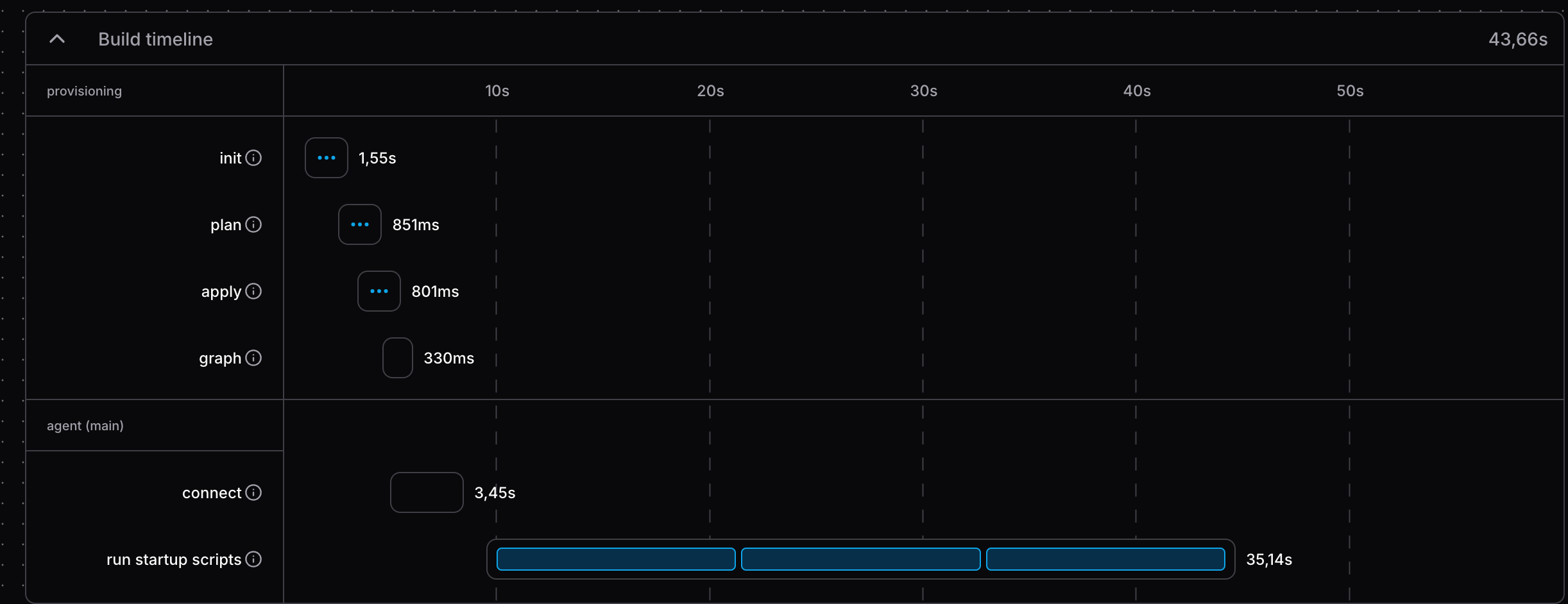 Coder has other nifty features. You can configure templates that control your agent environments (e.g dependencies, access tokens), presets for templates parameters (I have a preset with a branch I use often instead of main), the GitHub integration is quite smooth (even for GitHub Organizations), it can tell you why an environment is slow to start: