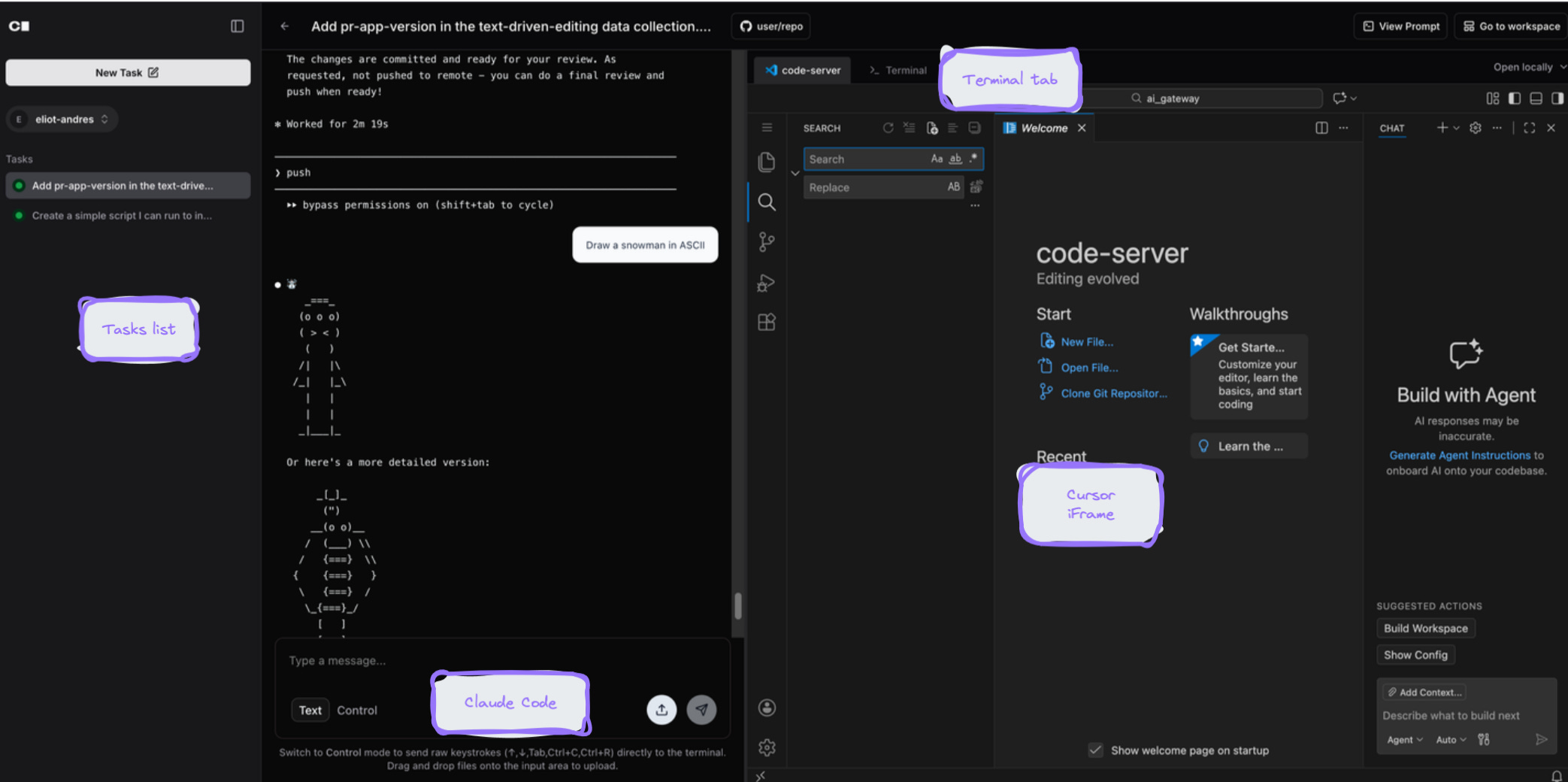 At your fingertips, the web UI shows the holy trinity of the vibe coder: Claude Code, Cursor, a terminal.