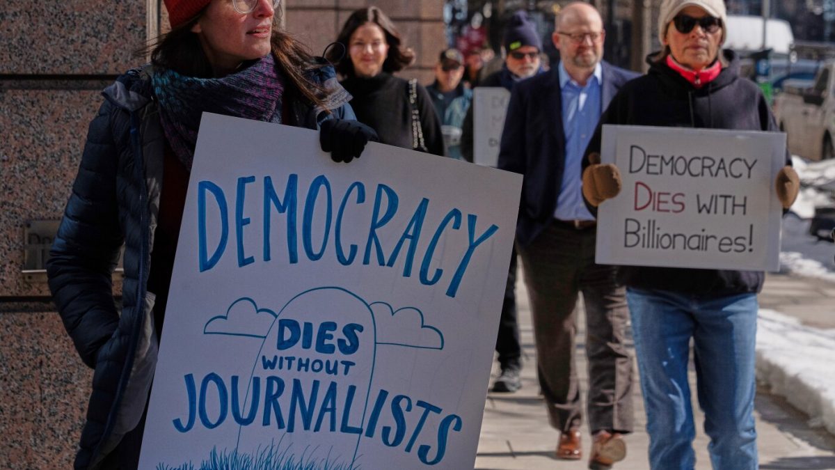 Sarah Kaplan, a Washington Post journalist, protests outside of the newspaper’s headquarters on Thursday, Feb. 5, 2026. That same day, CEO Will Lewis was photographed at the NFL Honors in San Francisco.