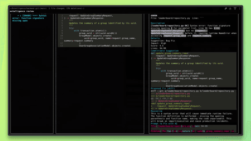 This example shows how a developer can use the Entelligence CLI to review local code changes before opening a pull request. The goal is to catch issues early and fix them while still in the development flow.