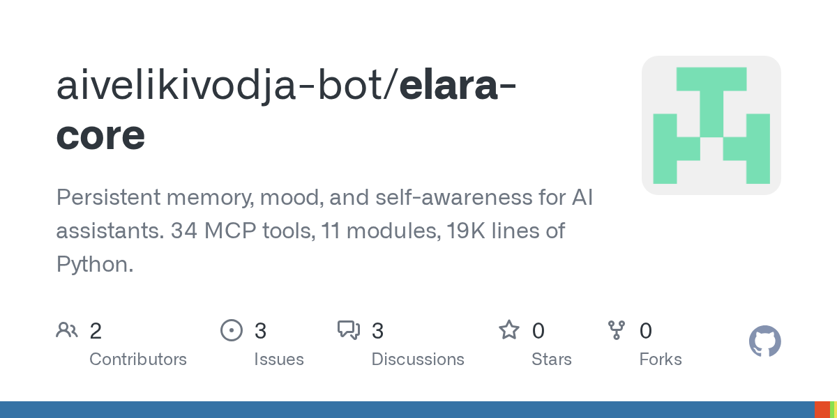 aivelikivodja-bot/elara-core: Persistent memory, mood, and self-awareness for AI assistants. 34 MCP tools, 11 modules, 19K lines of Python.