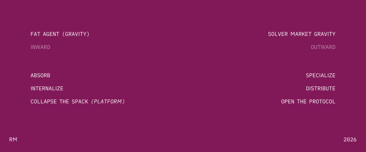 The Solver Market wants to commoditize the Fat Agent — make the orchestration layer open so any frontend can access the best solvers, and no single provider controls distribution.