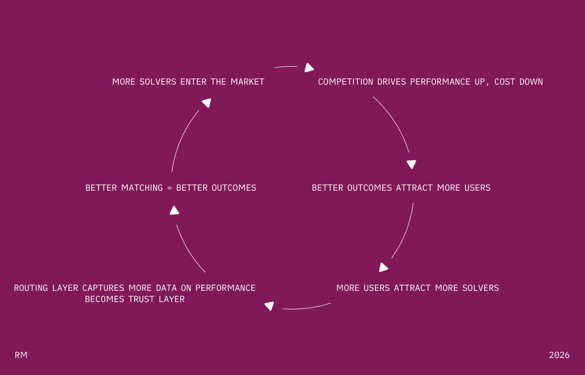 The flywheel doesn’t compound around a single provider. It compounds around the market itself. The routing layer — the protocol that decomposes tasks, matches them to solvers, evaluates quality, handles failures — gets smarter with every transaction. That’s where the fat accumulates.