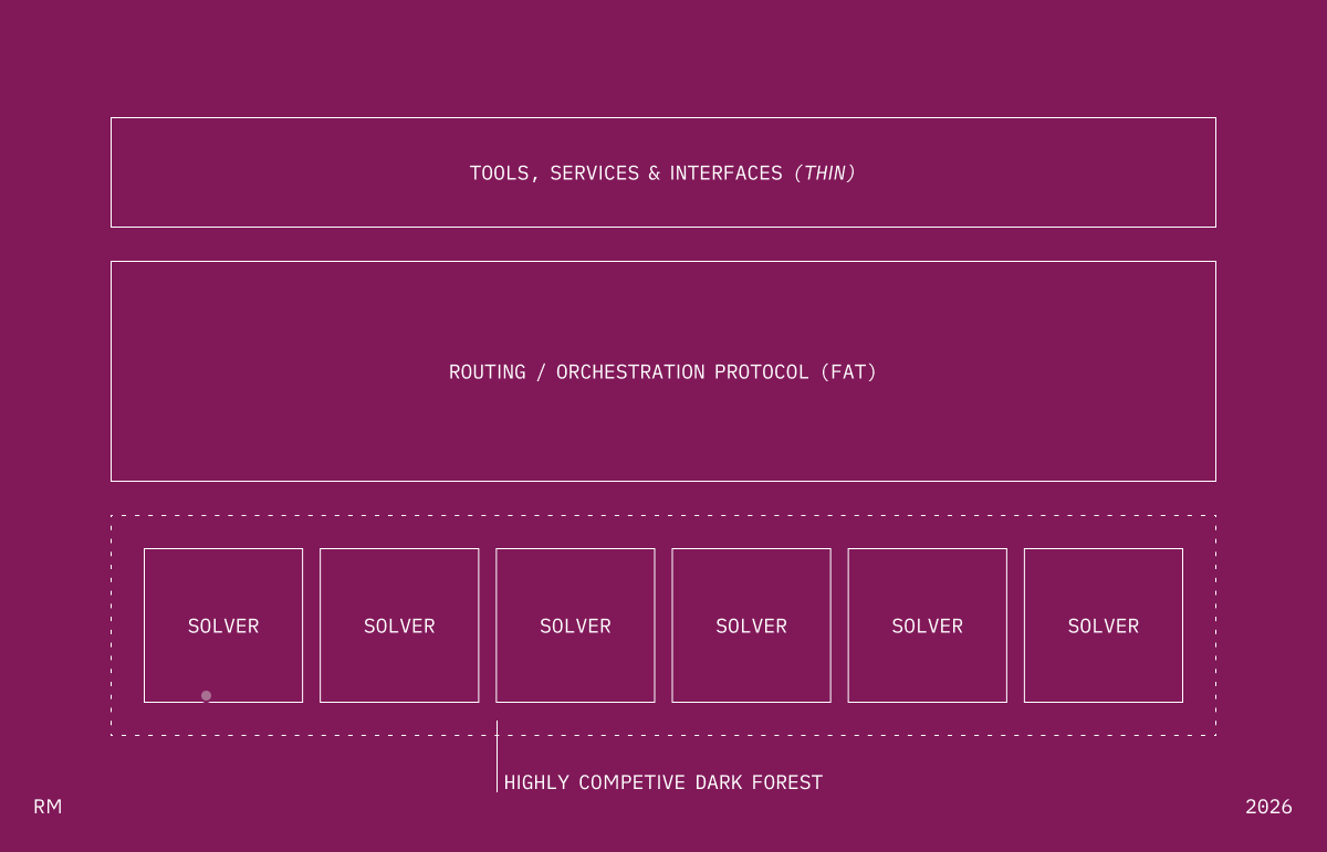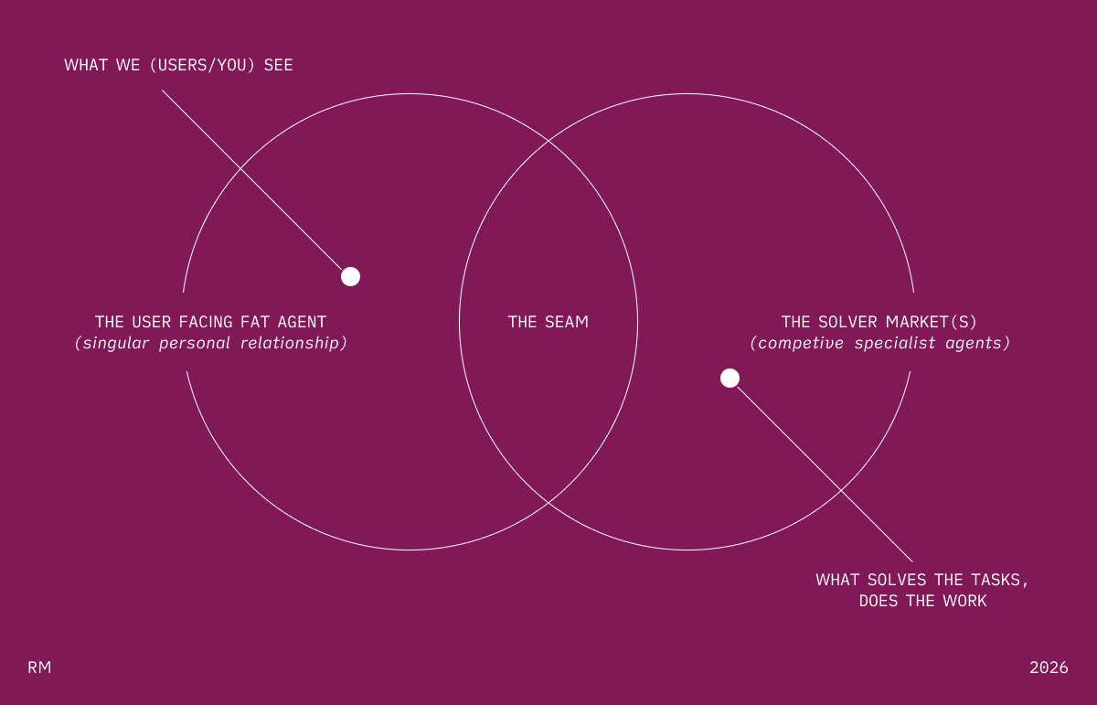 At the execution layer, the Solver Market probably dominates. Behind the scenes, the Fat Agent doesn’t actually do everything itself. It decomposes. It routes. It delegates to the best available solver — specialized models, fine-tuned systems, tool-use pipelines, other agents. The user sees one agent. Underneath, a marketplace.