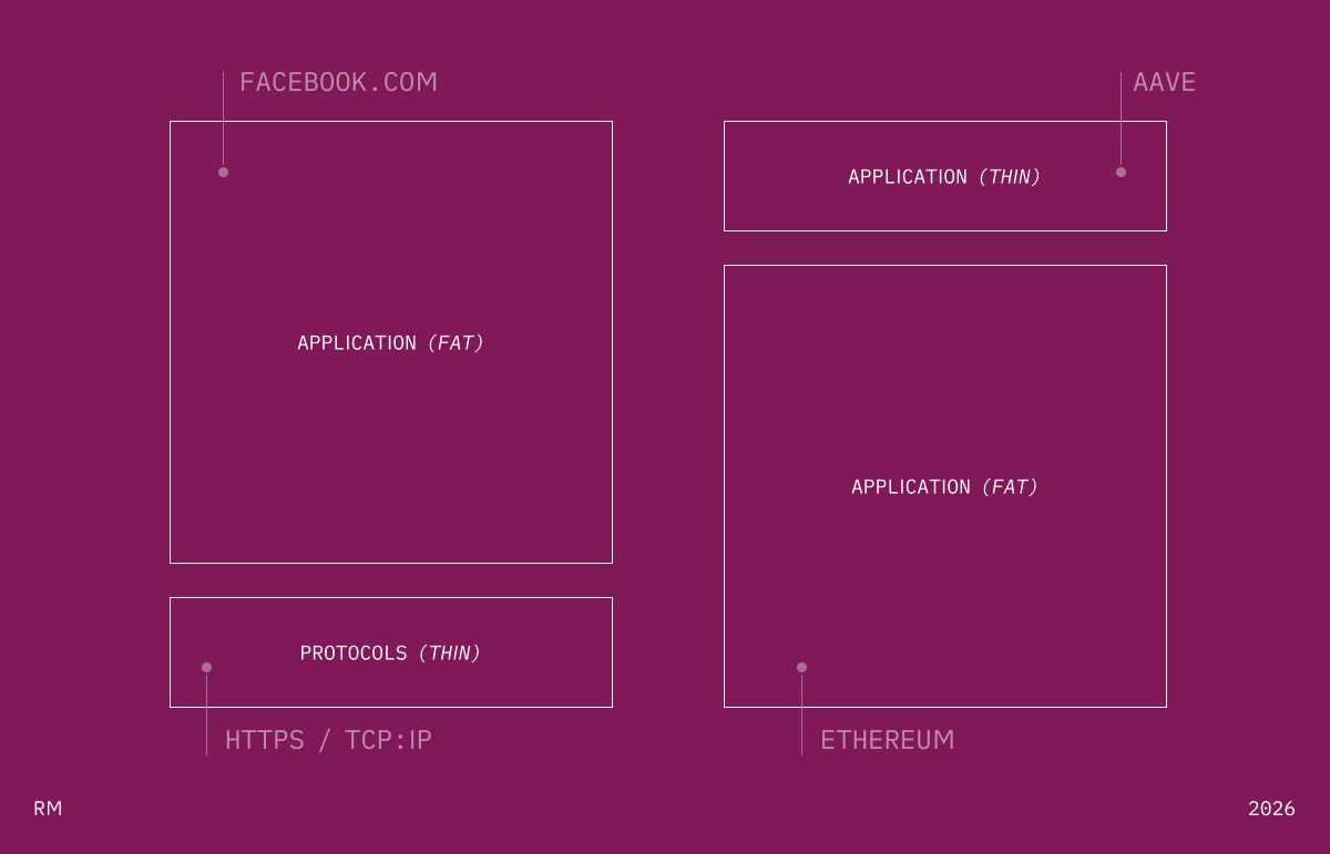 Joel Monegro tried to figure this out for crypto in 2016. The internet had thin protocols, fat applications. TCP/IP created immeasurable value — Google and Facebook captured it. The blockchain flipped it. Fat protocols, thin applications. One essay. One diagram. Somehow that affected an entire generation of investors how to deploy capital.