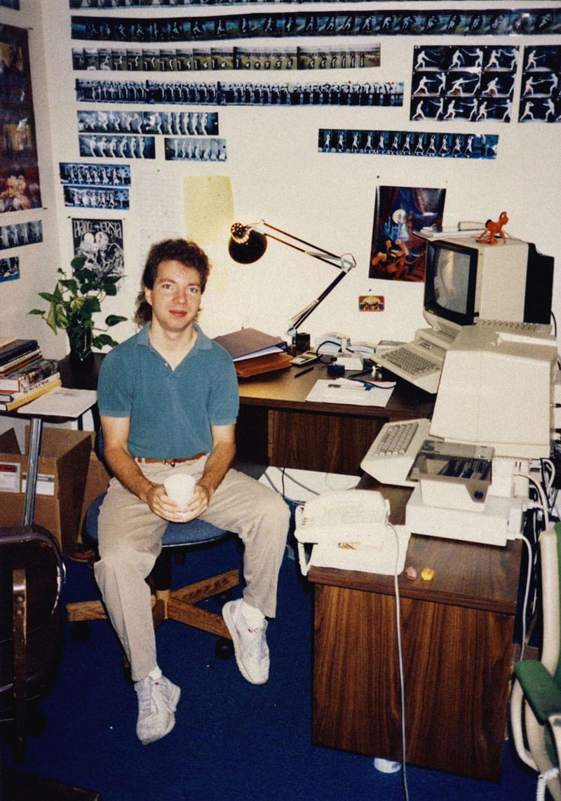 Jordan Mechner in 1989, with his rotoscoping materials on the wall. Courtesy of Game Developer.