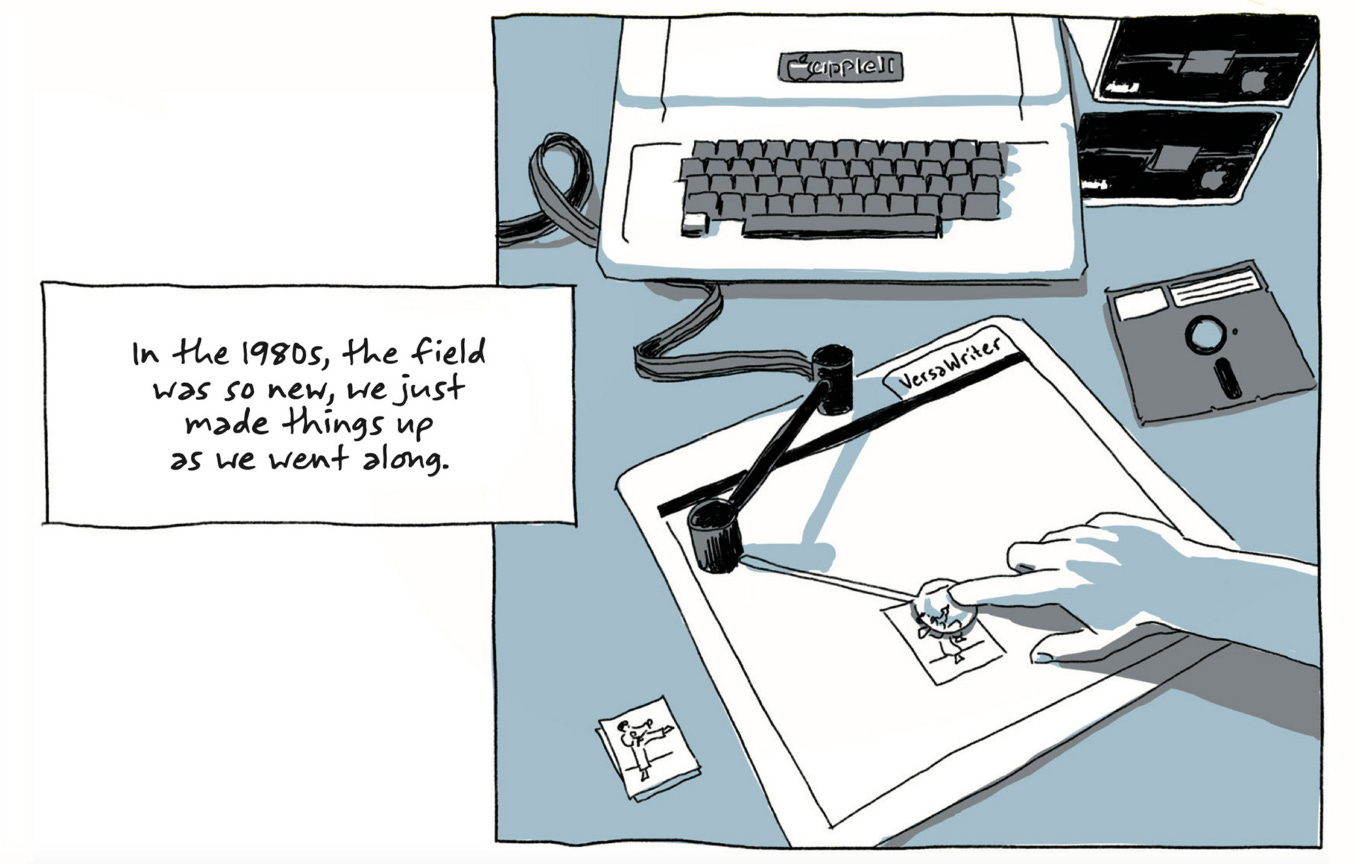 Mechner’s setup for Karateka was wild. Over his Moviola screen, he taped thin paper, upon which he traced key frames from the Super 8 footage beneath. Then he took his pencil sketches to a VersaWriter — an early drawing tablet — and traced them on that. Frames of movement became pixels on his computer monitor. From there, he cleaned them up with an art program he’d coded.