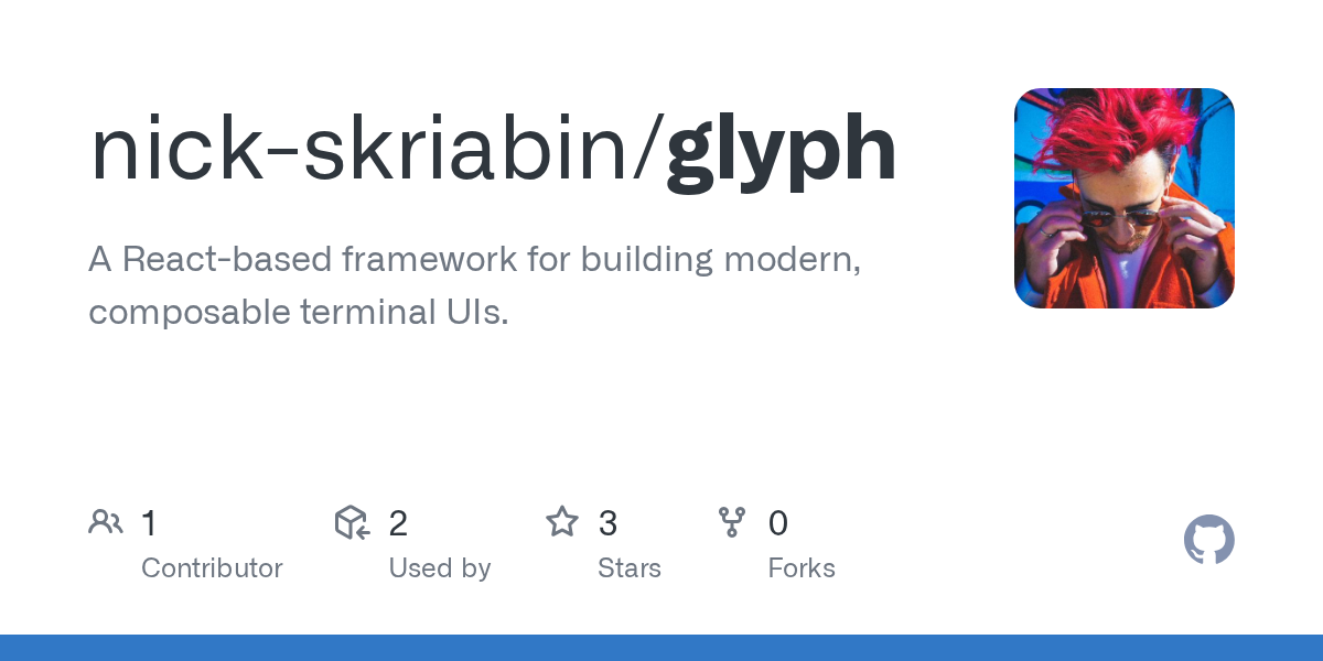Build real terminal applications with React. Glyph provides a full component model with flexbox layout (powered by Yoga), focus management, keyboard input, and efficient diff-based rendering. Write TUIs the same way you write web apps.
